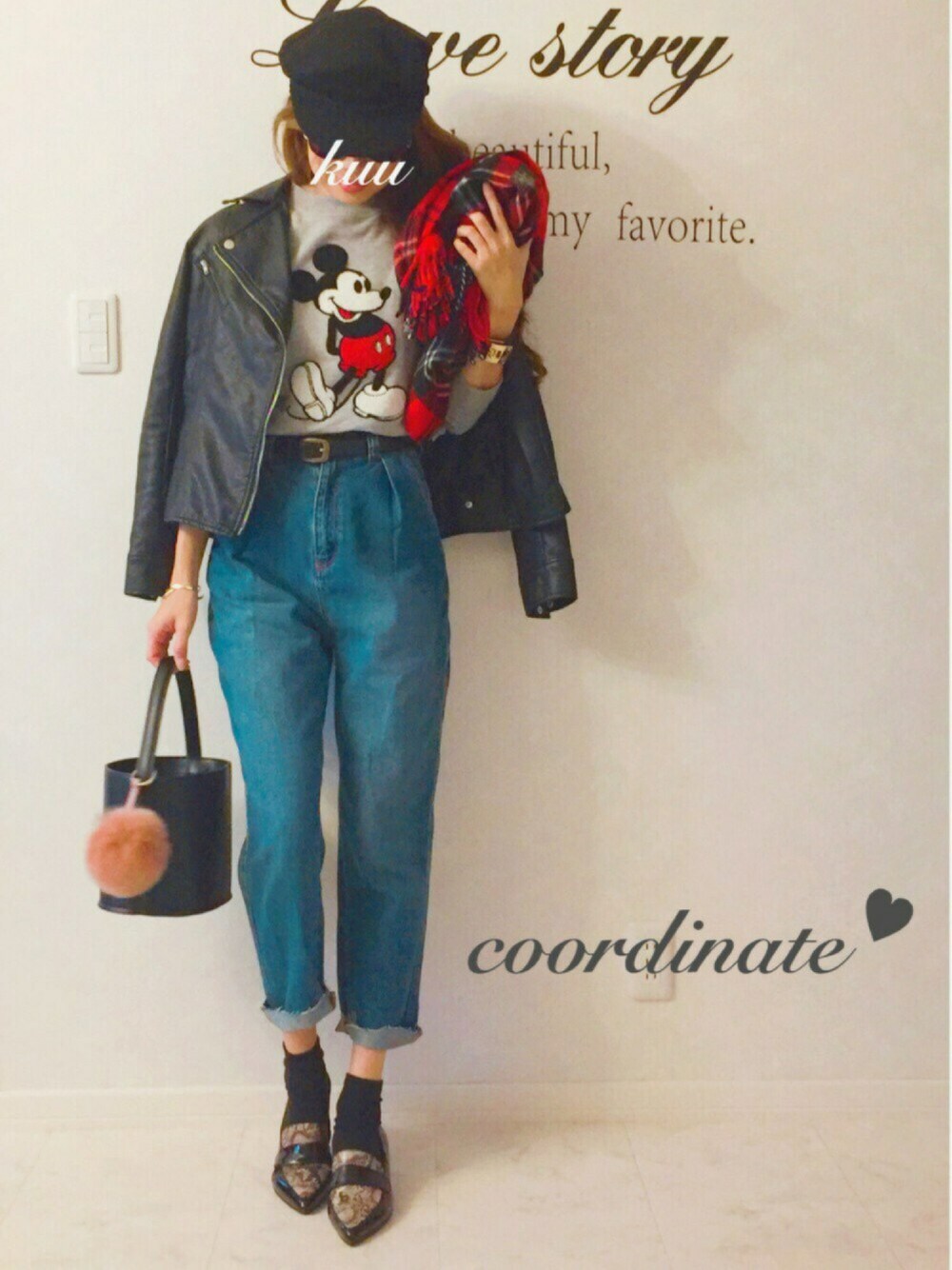 ご覧頂き有難うございます👀💕 ライダースのmickeyコーデです🐭💛💛。 足元はパイソン柄のローファーで 合わせました🔥💛💛。