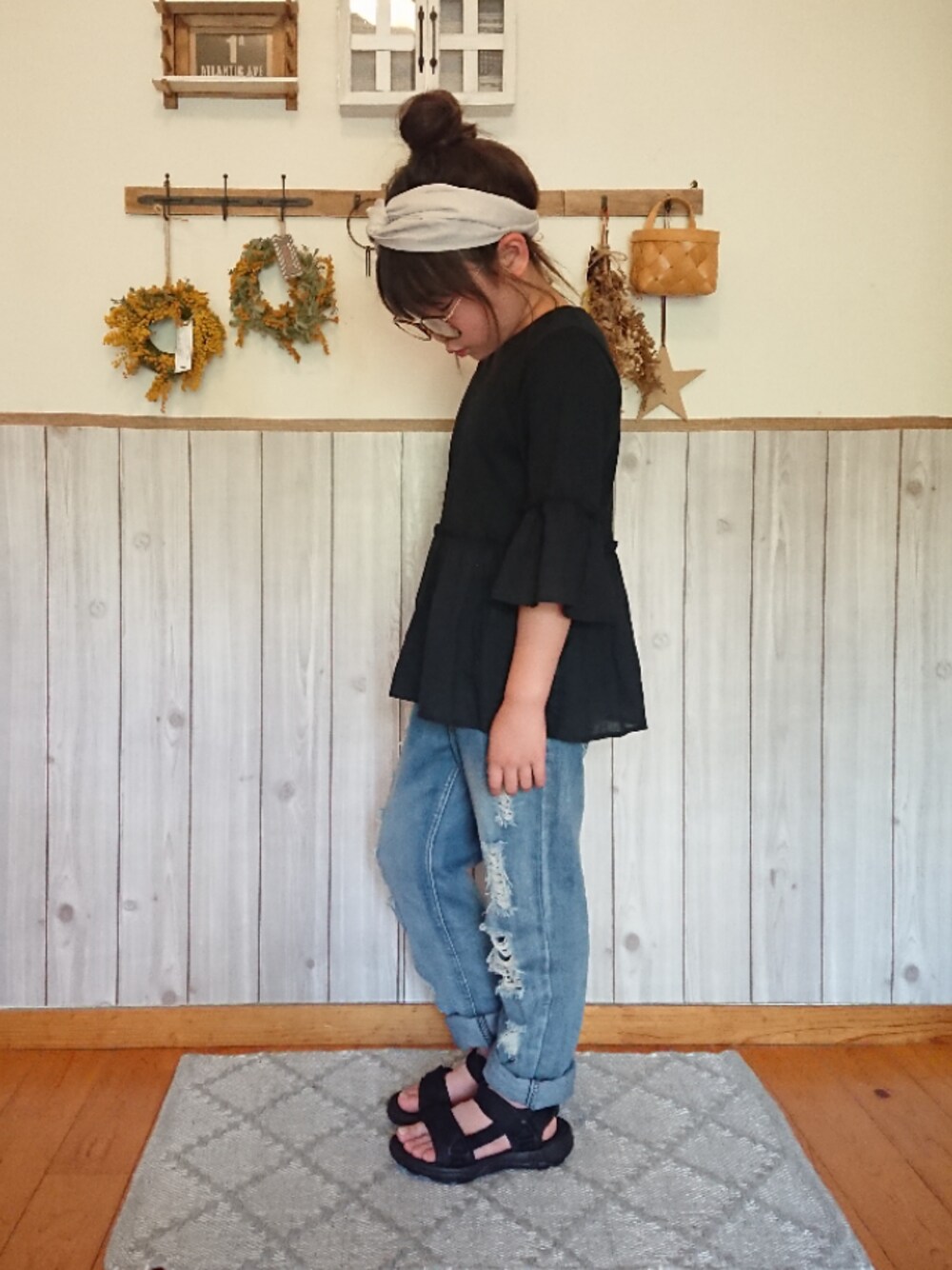 ku-amiのデニムパンツ「本格的なダメージ加工のキッズデニム」を使ったコーディネート