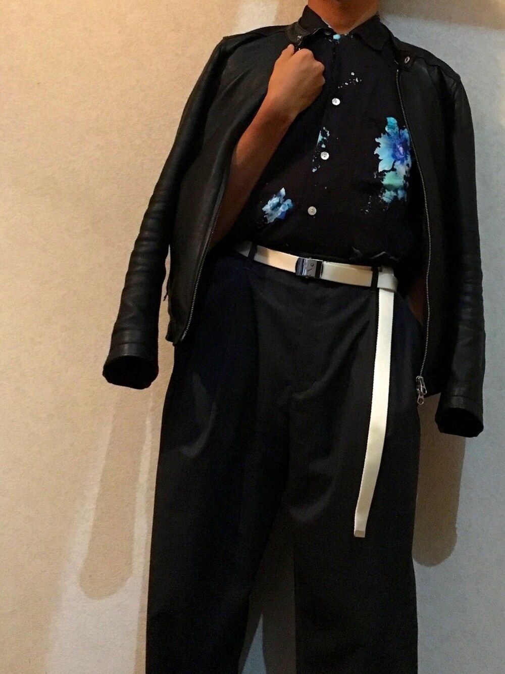 ライダースコーデ【シングル】🍁 下にはSTUDIOUSのイージースラックスとiTTiのガチャベルトを 上は夏に着てたNIPOALOHAのアロハシャツを1番上のボタンまでとめて、その上にライダースジャケットを1枚羽織りました! ライダースジャケットは下に着ている派手な柄を抑えて一気に大人カジュアルな雰囲気にさせる効果もあるのでオススメです! 今回はシングルライダースジャケットでしたがダブルライダースジャケットでも全然ありです!!
