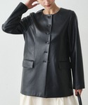 kuuusan(Loungedress)のライダースジャケット「ノーカラーフェイクレザージャケット」を使ったコーディネート