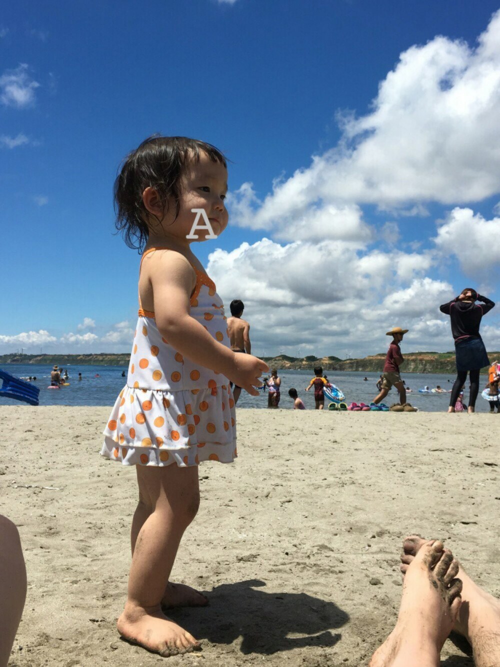 海ーーーー❗️(1週間前💦) 初水着は運命を感じた、あんず柄♡ 高いから来年も着せるぞって思って買った90サイズなのに、もはやパツンパツン😂 安定のむっちりワガママボディ、ここにも居ますよ✋笑笑