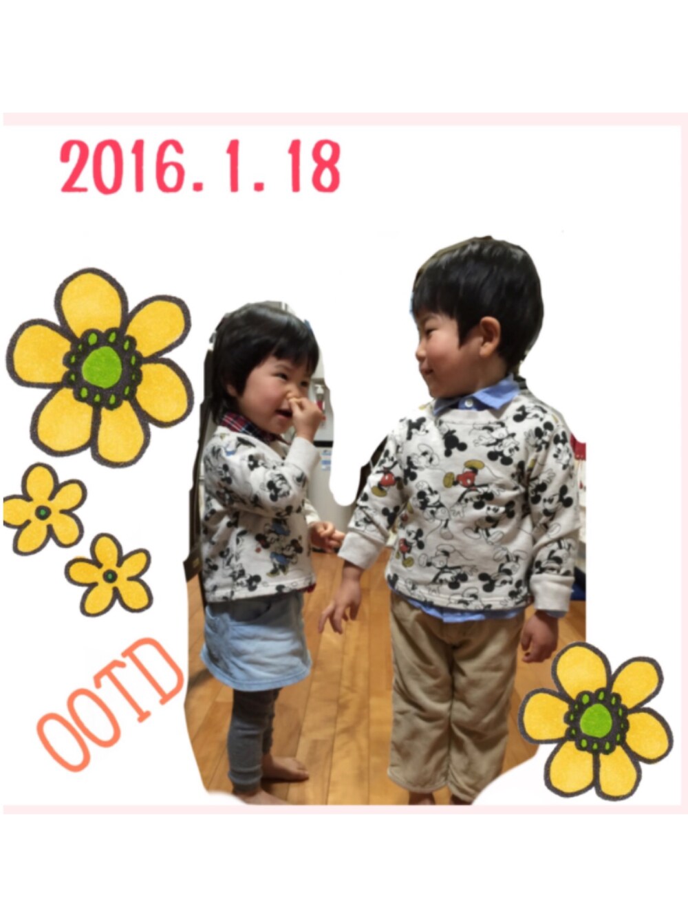 兄弟でお揃いコーデ 兄はミッキー、妹はミニー 妹の方、シールを鼻に突っ込んでるとこでした ( ̄▽ ̄)