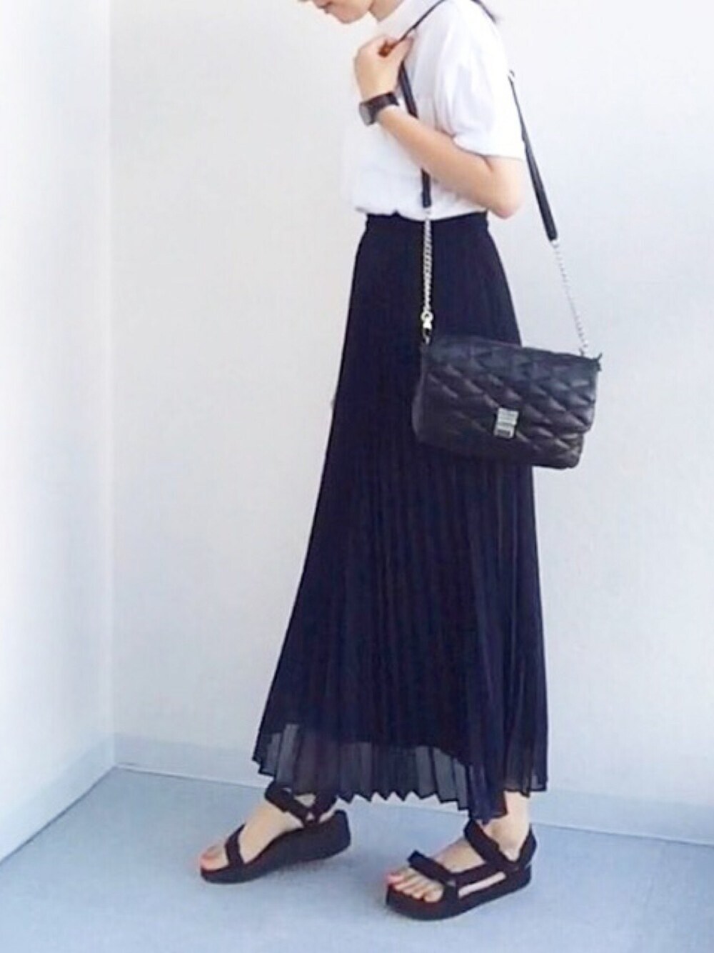 2016/07/31 ユニクロのシフォンプリーツスカート は気に入りすぎて2色持ち✌️ サラサラしているので暑い日には着心地抜群! お値下げされてたからカーキも欲しいなぁ😍 トップスはクロップドクルーネックTで上下ユニクロでした☺️ ネイビーのロングスカートって一歩間違えるとママさんコーラスだよね( ̄▽ ̄;)