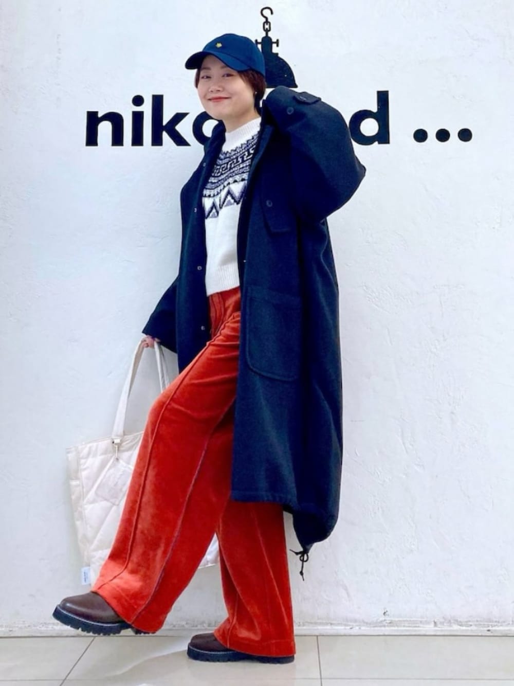 ノルディック柄ニットをカラーパンツでカジュアルにスタイリングしました♡ ニットはショートを選ぶと足長効果ありのパンツです!