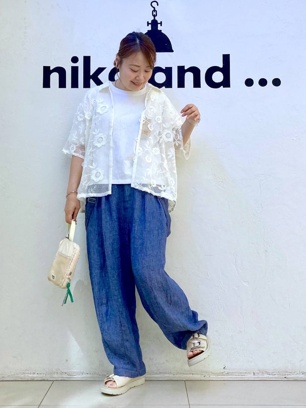 爽やかに着るキレイめナチュコーデ! ▶︎シャツ→Long丈 新作の立体的なお花のレースが可愛い前開きシャツ! 透け感を楽しむレースシャツは、 インナーに同系色を選ぶと馴染みやすいです✨ 腰回りが気になるカワモトは腰回りカバーできるLongをチョイス🫰 ▶︎Tシャツ→Short丈 新作Tシャツは後ろにステッチが効いたシンプルTシャツ! UVカットしてくれて、 お洗濯に強いので、汗ばむ紫外線多い夏にヘビロテしていただけます! ショートは骨盤にかかるくらいの着丈です! ▶︎パンツ→Lサイズ リネンの雰囲気良いサス付きパンツ! サスは取り外し可能で、 丸みのあるシルエットが可愛い! リネンのチクチクが苦手なわたしですが、 こちらは柔らかくて大丈夫でした! ウエストの後ろゴムはそんなに伸びるタイプではないのでLサイズチョイス! ♡ニコアンドゆめタウン広島店イベント♡ 8月4日(日) キャッシュレスゆめカード値引き積立額5倍! ♡Instagram♡ staff boardもInstagramもどちらも フォローお待ちしております♪