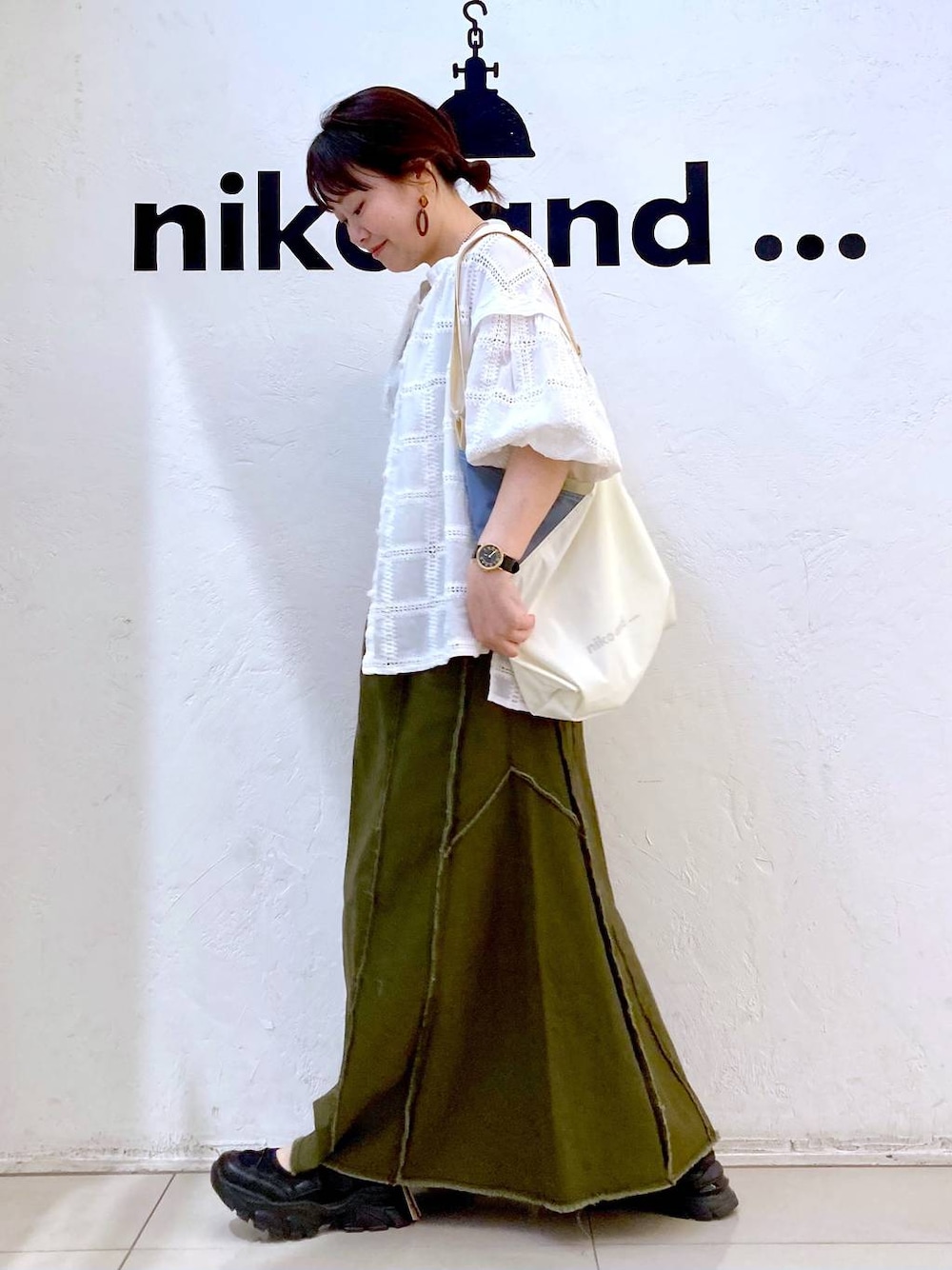ナチュラル好きの大人カジュアル! ▶︎シャツ→フリーサイズ モードノームの新作のバンドカラーシャツ! モードノームでよくある袖口リブデザインが可愛い! ゴムがすごくソフトなので肘くらいまでたくしても柔らかくていい感じでした! そんなに薄すぎないので透け具合がかなりソフトで 大人も着やすい感じです! ▶︎スカート→Lサイズ みさよさんプロデュースのロングスカート! 着痩せ効果大のスカートでサイドの斜めの切り替えから広がるので、 マーメイドラインのようなシルエットになって、 気になるお尻、腰、太ももがスッキリ見えるのです😎 ウエストは総ゴムで、サイドで調節できるよ! わたしは両サイド3センチ前後絞るとちょうど良い感じです! ♡ニコアンドゆめタウン広島店イベント♡ 4月15日(火) キャッシュレスゆめカード値引き積立額5倍! ♡Instagram♡ staff boardもInstagramもどちらも フォローお待ちしております♪