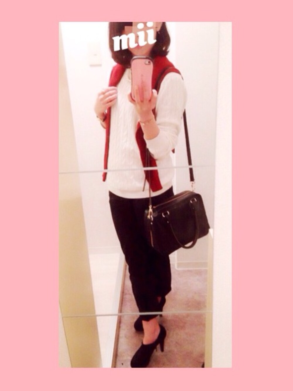 UNIQLOのケーブルニットはメンズものなので、ゆったりしたサイズ感でカジュアルに。 だけど、あまりカジュアルになりすぎないよう、赤のカーディガンでプロデューサー巻き+ビジューネックレスで女性らしく❤︎❤︎ パンツスタイルなので足元はヒールを履いて引き締めて。