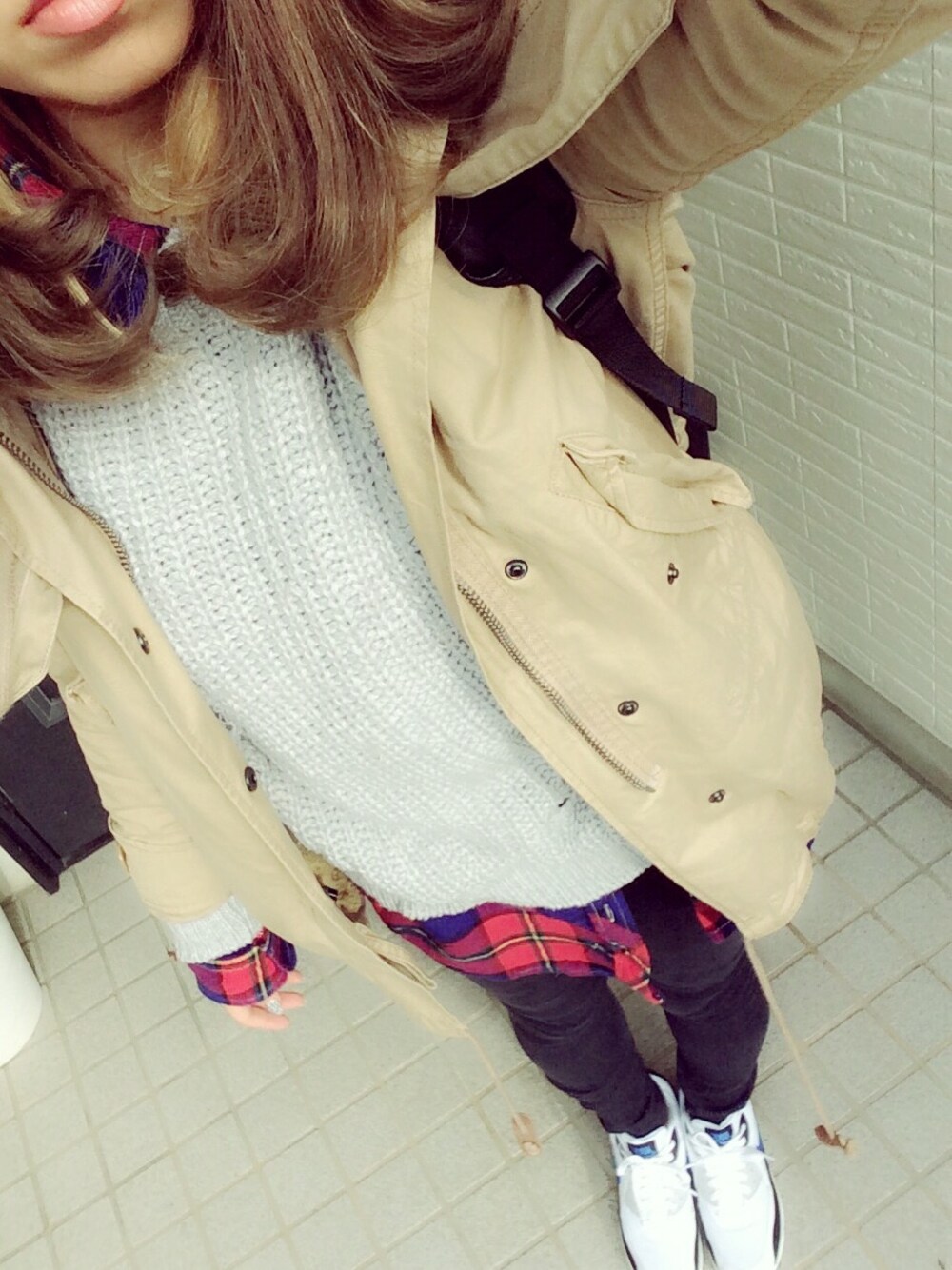 ネルシャツ グレーニット 黒パン ベージュモッズコート スニーカー リュック