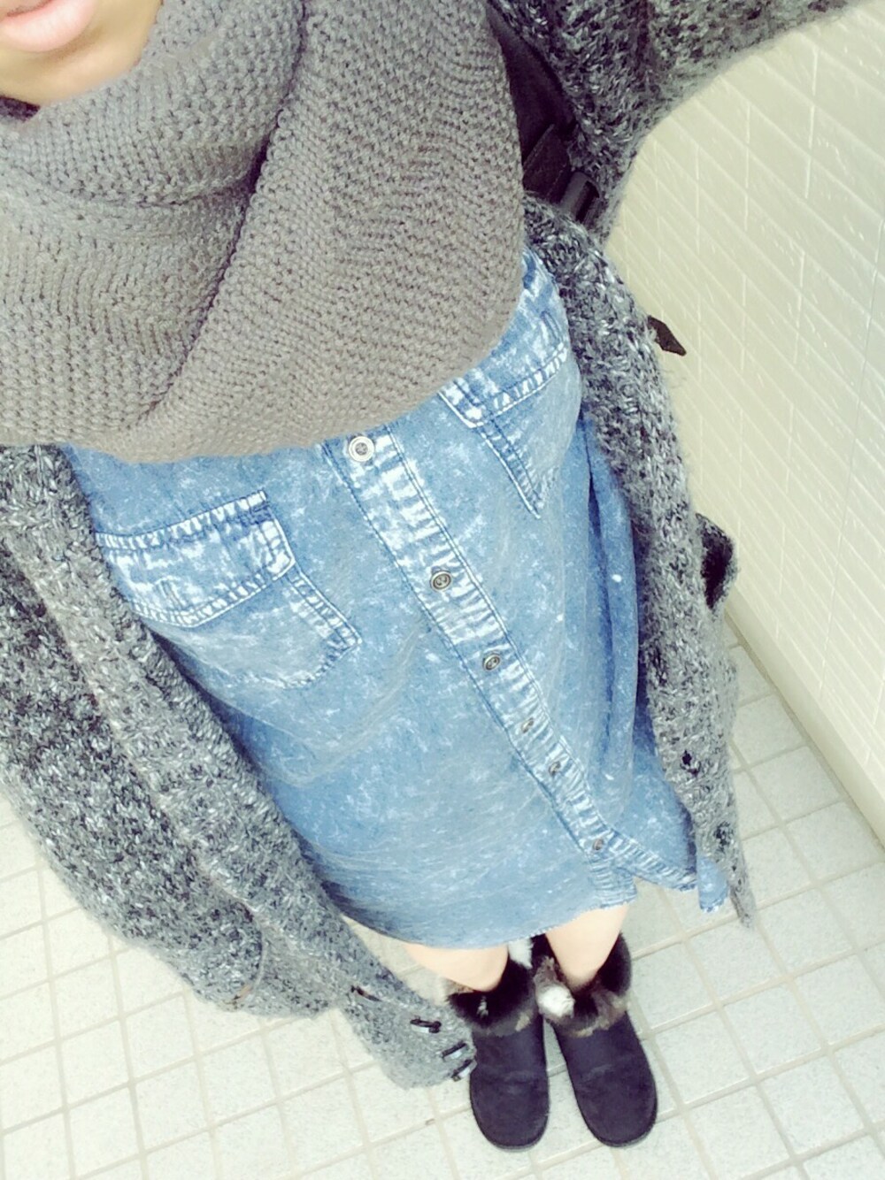 デニムワンピ ロングカーディガン スヌード 黒ムートン 黒リュック