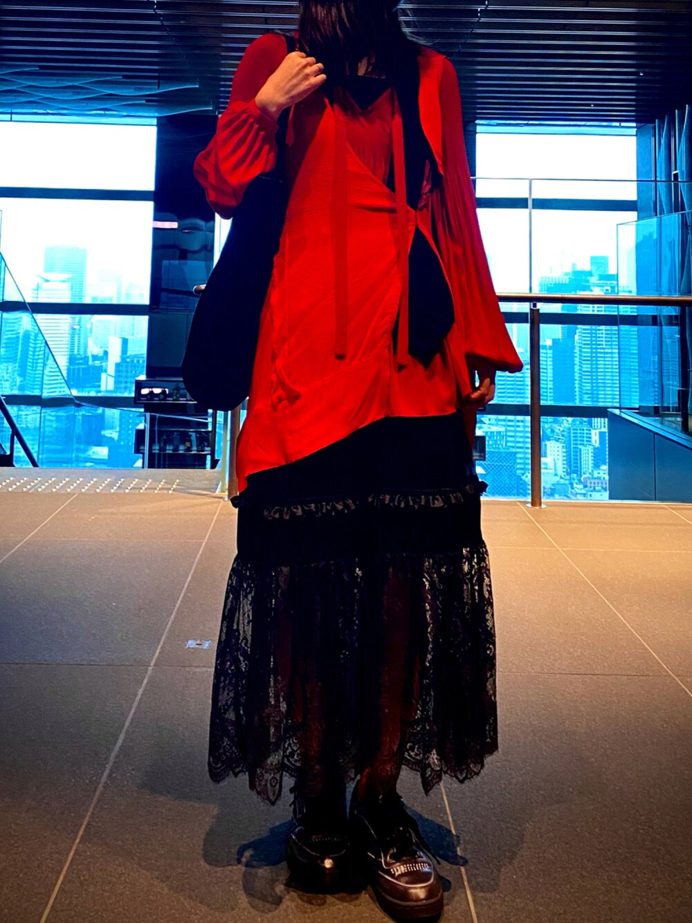 秋の全力レイヤード ブラウスの上にジレを2枚重ねてます☺︎ 赤×黒 最強◎