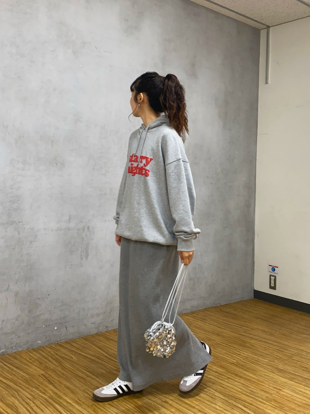 グレーのカジュアルなパーカーも ワントーンで合わせると 少し落ち着いた雰囲気になるのでおすすめです♡ 身幅たっぷりのパーカーと 伸縮性抜群のスカートで楽ちんコーデ♡