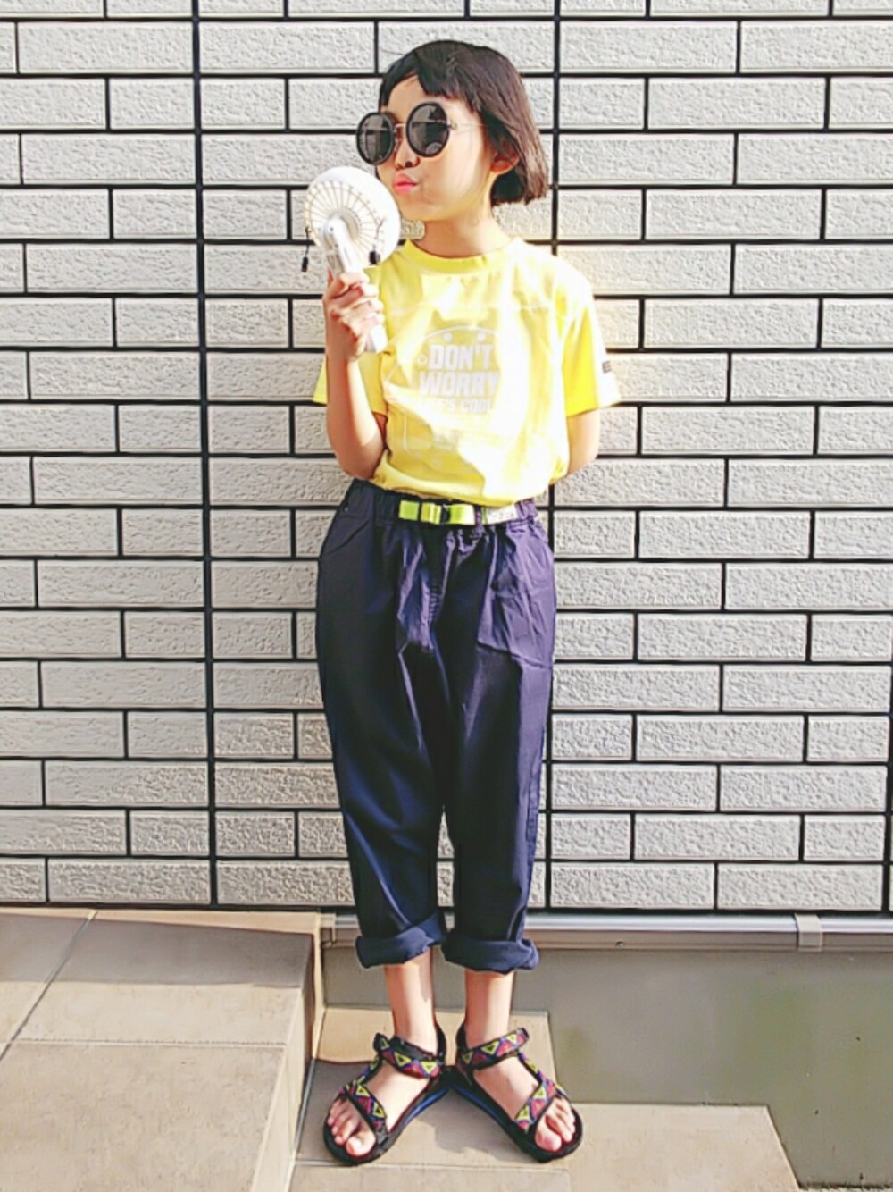 ご覧いただきありがとうございます😃 イエロー×ネイビー★anko ボーイズライクが好きなんですぅ❤️ 暑いからハンディ扇風機を持って(笑) サラサラパンツ涼しげよ~♪