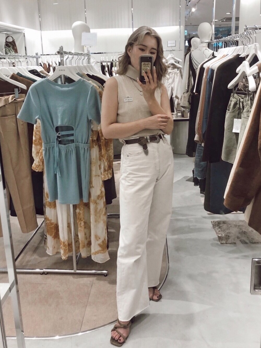 リアル店頭でのオールホワイトコーデ🤍 ワイドパンツと合わせるトップスは すこしぴったり目のものを合わせると すっきりスタイルUPします🌜 小物はブラウンにしてシメ色に🤎 instagram ☞ @kyaaari_25