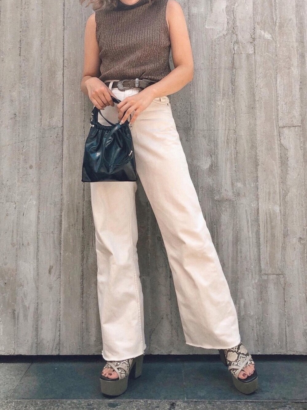YUUKA のニット/セーター「ラメタートルノースリーブ」を使ったコーディネート