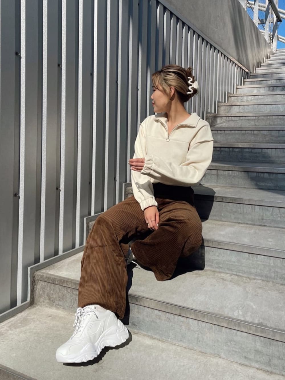海外ガール意識︎ ︎❣︎ 淡色系ラフコーデ♩Tops ▷ 凹凸のあるワッフル生地は体の間に空気の層を作り出し、体温を逃がさない効果があります。毛玉も出来にくく可能性に優れています♡ ファスナーを開けて襟抜きで着たり、全部閉めてハイネックで着たりと用途に合わせて着回し可能です✌︎ 袖口と身頃の裾にゴムが入っているのでお好きな丈感で着用できます♩ Bottoms ▷ 秋のトレンド生地コーデュロイパンツ。濃いめのブラウンカラーをコーデに取り入れるだけで一気に秋コーデに♩ワイドシルエットですがハイウエストで丈長めなのですらっとした印象でスタイルアップ効果も抜群♡ 162cmの私だとスニーカーで着用可能です。Shoes ▷ ごつめのソールがかわいいオリジナルスニーカー♡ とにかく軽くてビックリしました!!ふかふかのクッションが効いているので歩きやすく、オフホワイトのカラーがコーデのワンポイントになること間違いなしです。楽ちんなのに6.5cmの厚底なので身長も盛れちゃいます✌︎
