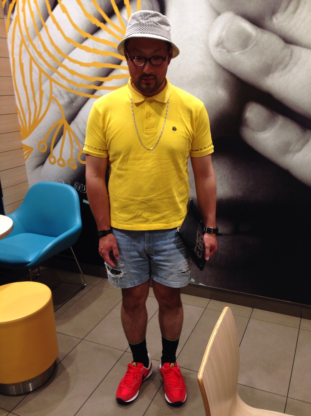 帽子:Supreme×BrooksBrothers ポロシャツ:SOUND PELLEGRINO×PHENOMENON クラッシュデニム:Mr.GENTLEMAN スニーカー:NIKE クラッチバッグ:PHENOMENON アクセサリー:Mr.GENTLEMAN、AMBUSH