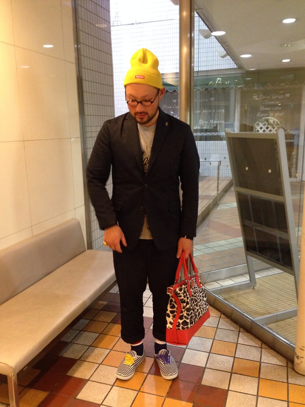 右手上げる瞬間コーデ ニットキャップ:SUPREME ジャケット:Dickies×MACKDADDY Tシャツ:MACKDADDY パンツ:Dickies×MACKDADDY スニーカー:Mr.GENTLEMAN×VANS バッグ:COACH