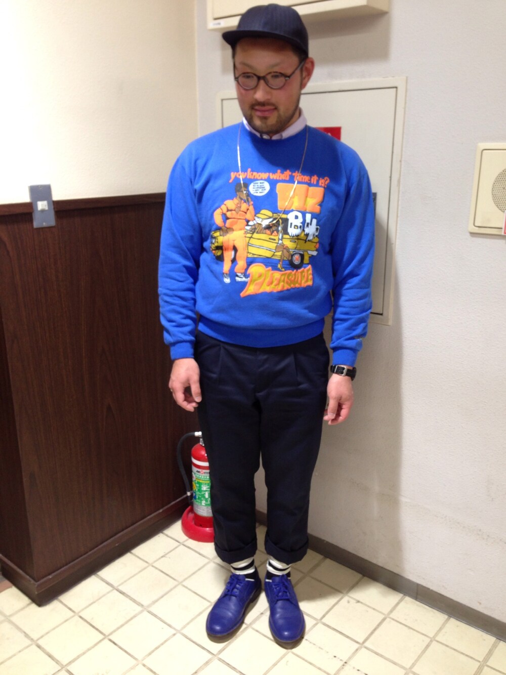 また、寒いのに逆戻り…(T_T) ピンストライプキャップ:Mr.GENTLEMAN スウェット:BBP シャツ:Mr.GENTLEMAN パンツ:MACKDADDY×Dickies 靴:Supreme×Clarks ネックレス:Mr.GENTLEMAN クラッチバッグ:PHENOMENON