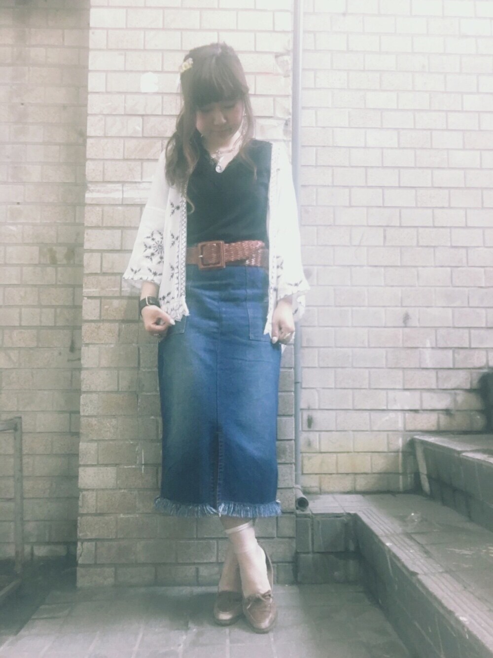 SPINNSのVネックレースカットソーは万能すぎて4色買い♡ ショートガウンとデニムタイトスカートでシンプルに*