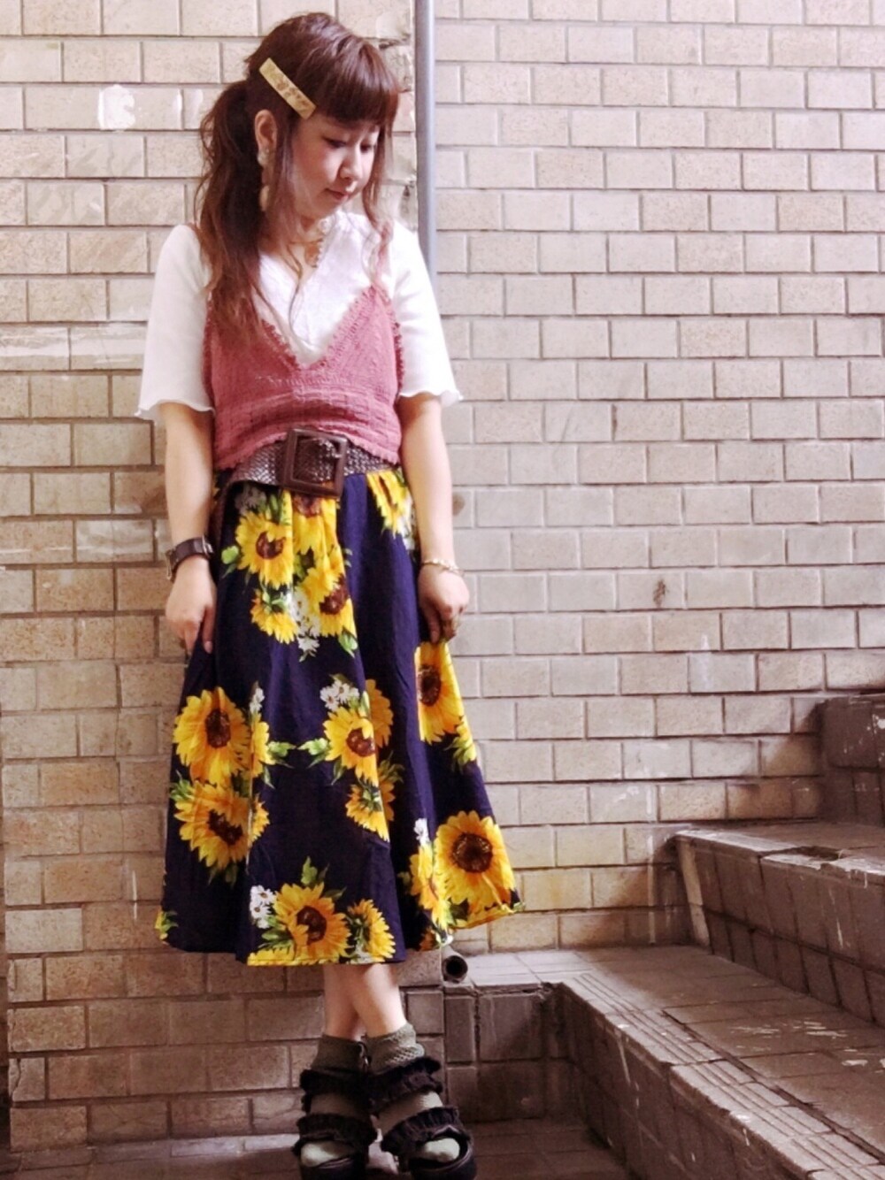 ひまわり🌻スカートにピンクのキャミで夏コーデ♡