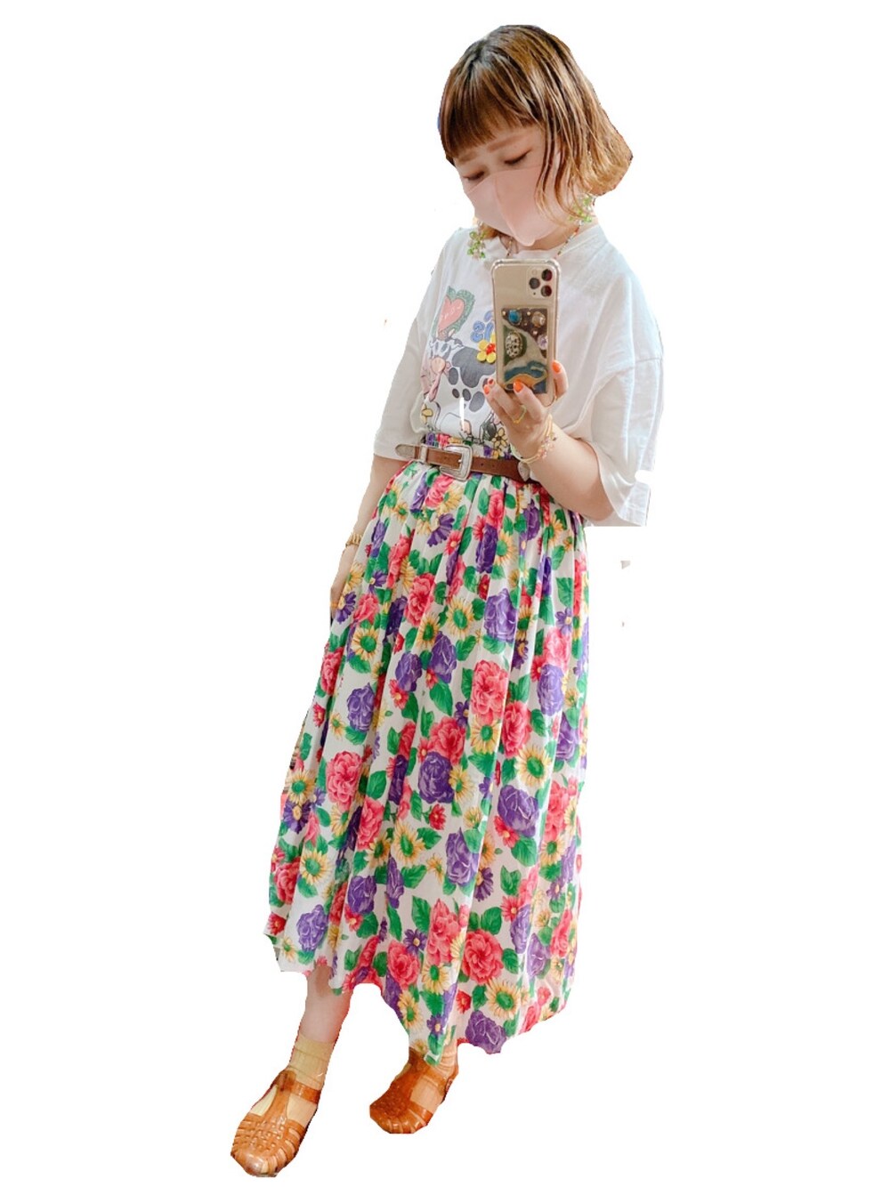 POPでhappyな🐄さんやお花🌼プリントの古着のTシャツ🧡 カラフルなお花のスカートに合わせて🌷🌼🌻