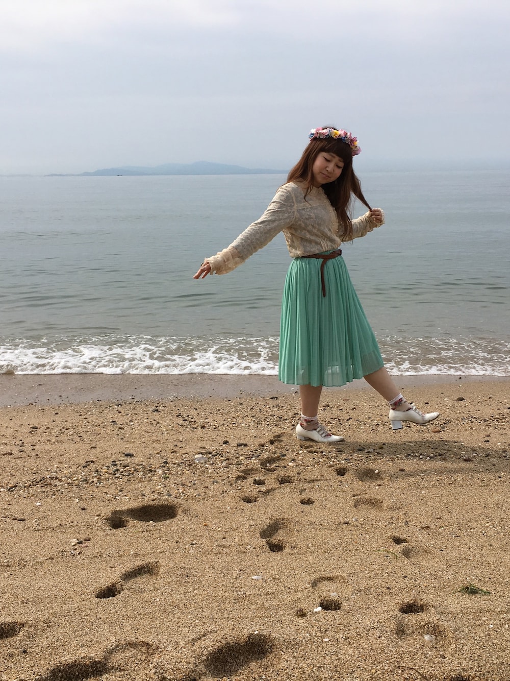 淡路島プチ旅行で海にて* ミントグリーンのシフォンプリーツに花冠で春コーデ*
