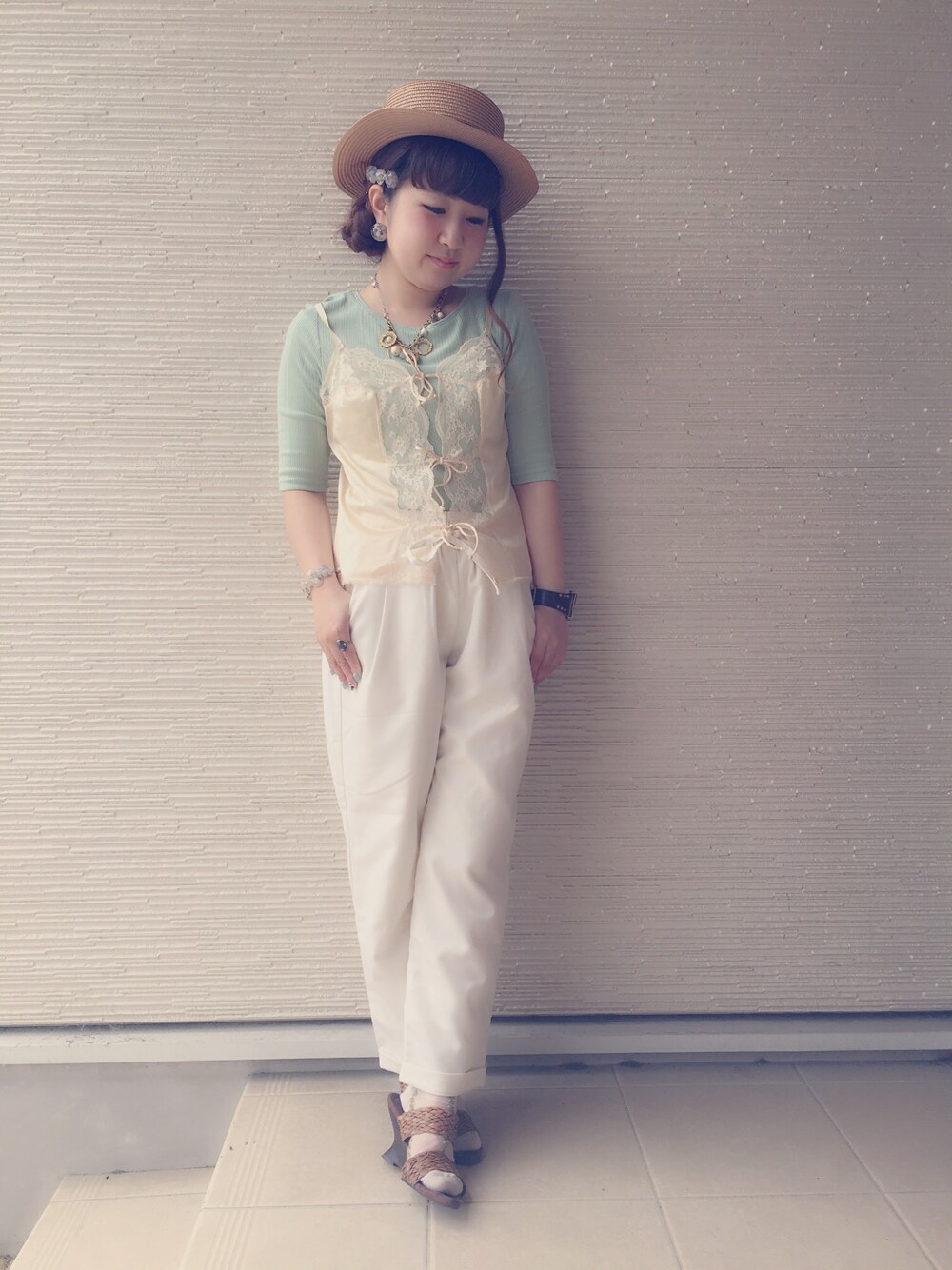 トレンドのランジェリーキャミを主役にミントグリーンとホワイトで夏コーデ* vintageのネックレスをプラス☺︎