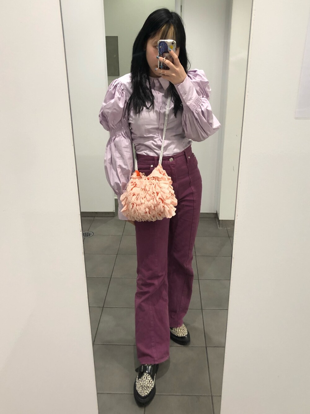 色が着たくてパープル系で合わせた🦄 ZARA今ボリューム袖のアイテム 多くてコレも本当に可愛い!💜 急いでてくしゃくしゃだけど(笑) LAGUAJEMの縦ラインのパンツは やっぱりスタイルよく見えるから愛用👯♂️