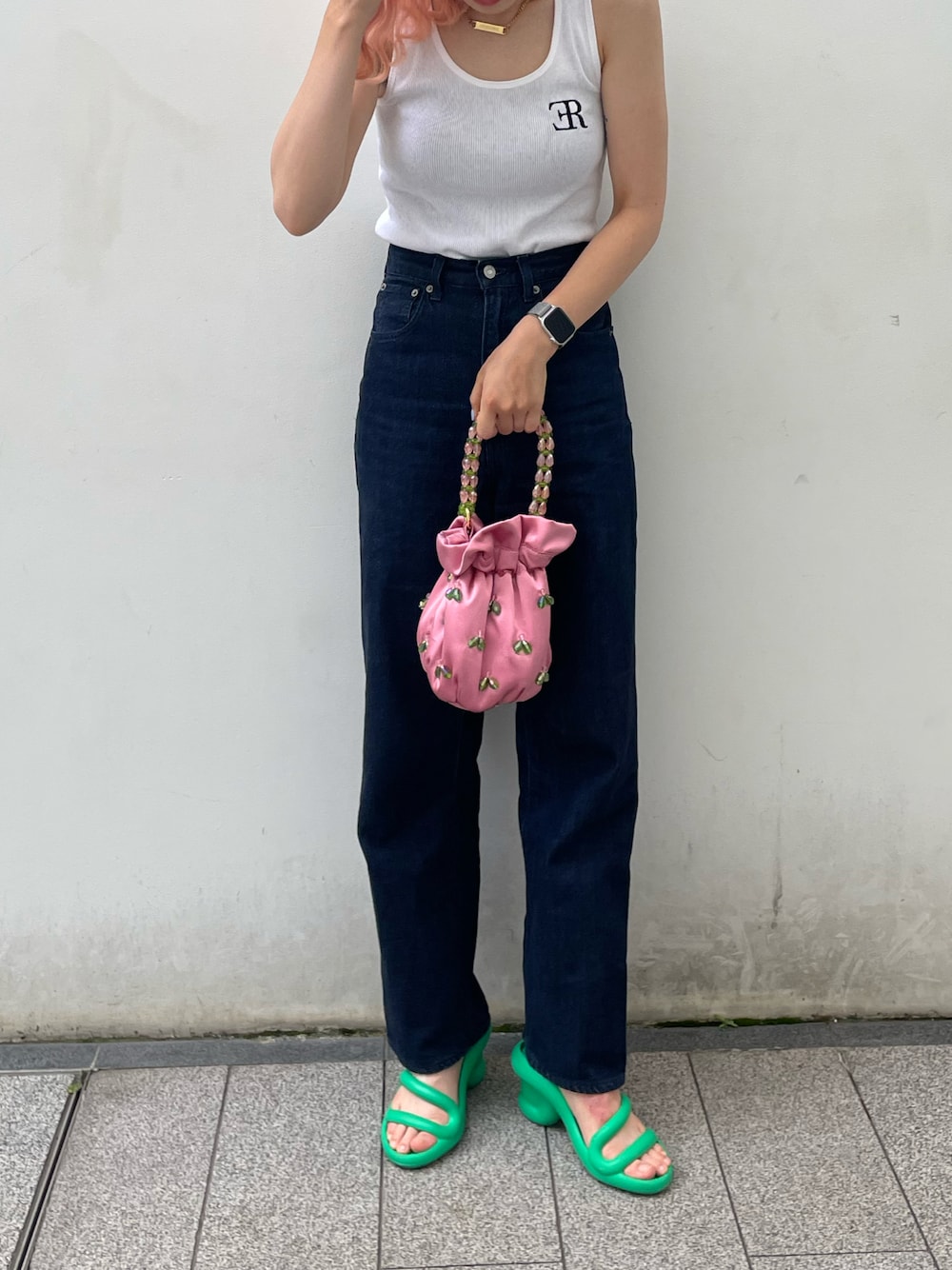 モデルのemmaちゃんとスタイリストのりのさん のブランドの“ER”🖤 求めてた形のタンクトップをシンプルに着て 小物で遊んでみた🥦