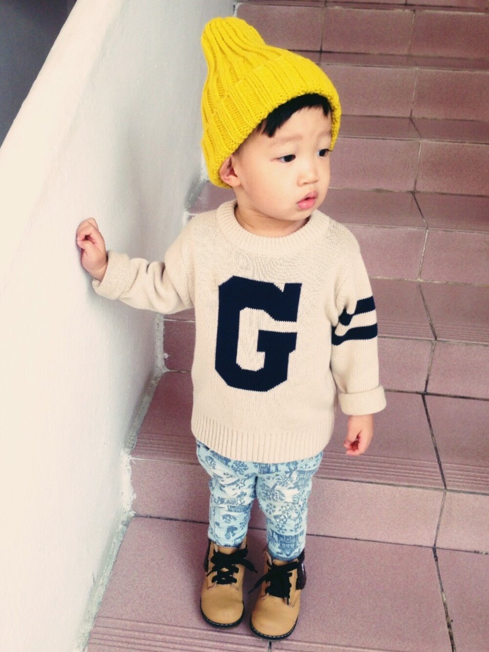 ベージュ系のニット/セーター、イエロー系のニットキャップ/ビーニーを着用したキッズの秋コーディネートの1枚目の写真