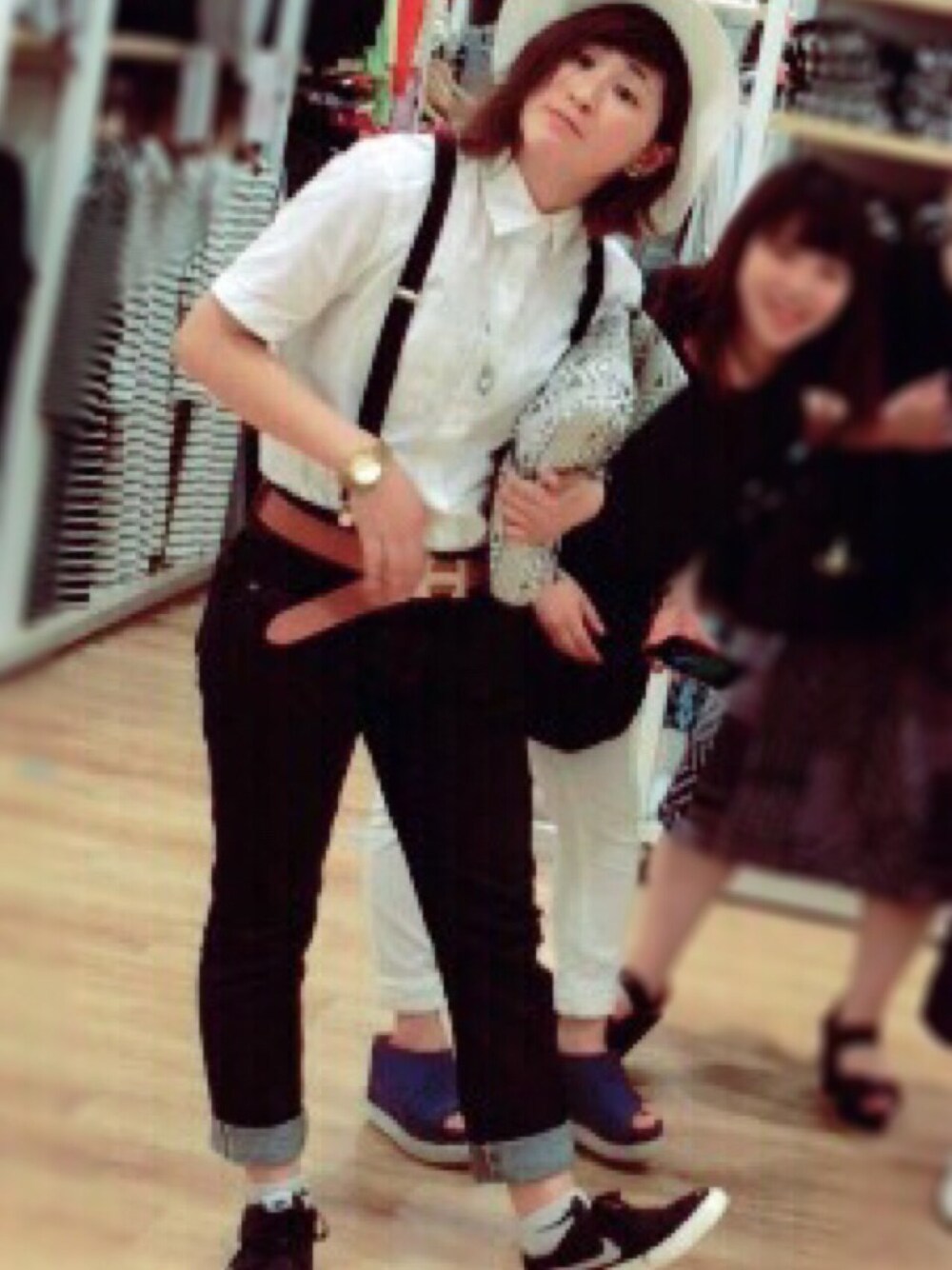 初サスペンダー\( ö )/ 半袖の白Tシャツにエスニックのネックレスをワンポイント✩⃛✩⃛ 夏に向けて買ったお気に入りのクラッチで楽チンコーデです৲( °৺° )৴