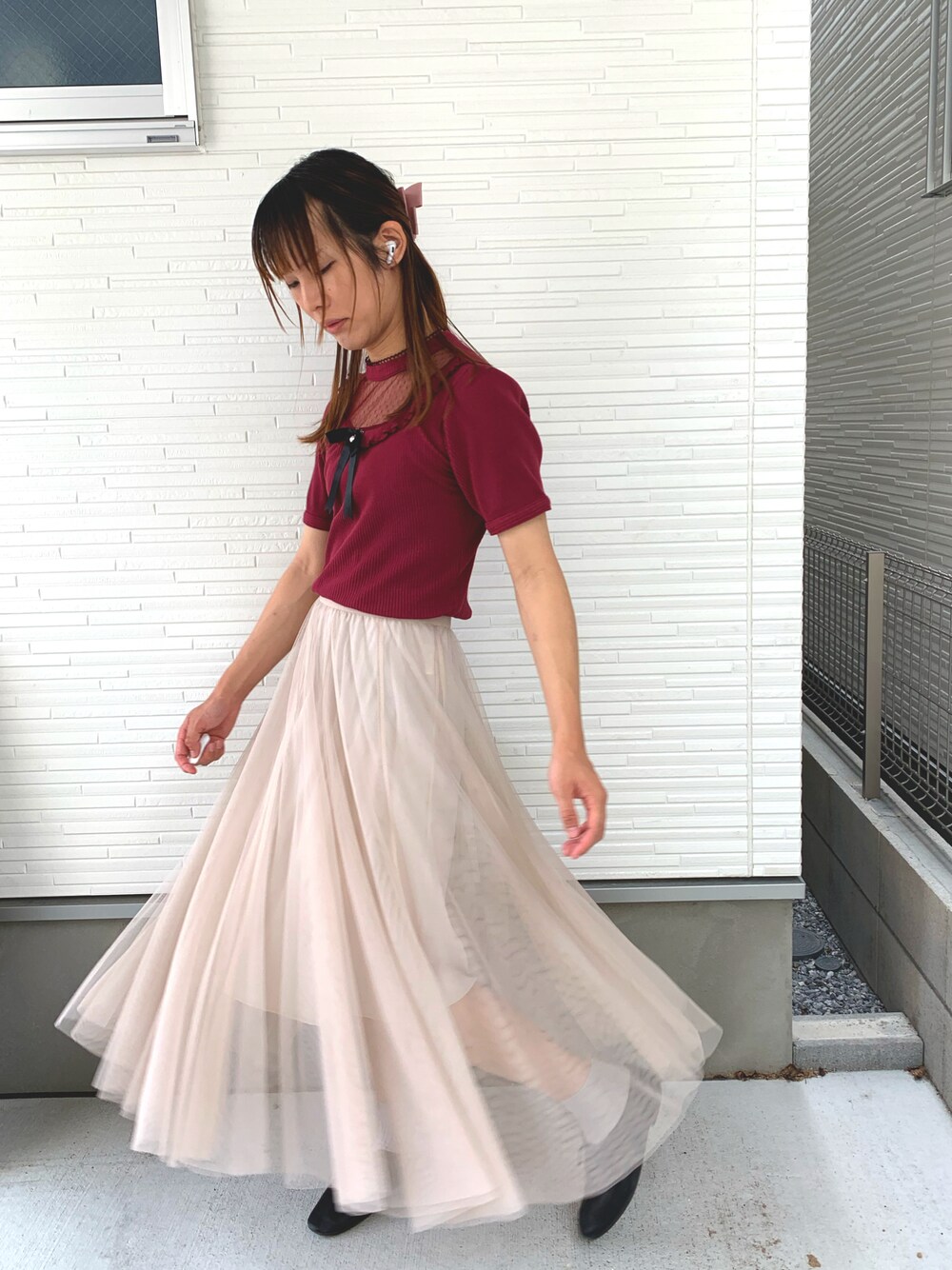 ふわふわスカート✨ 赤いトップス秋っぽいかなー🍁
