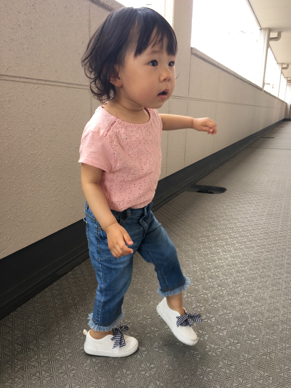 流行りの刺繍とピンクを取り入れたコーディネートです。スニーカーの紐がギンガムチェックのリボンになっているのでいいアクセントになってます。今は子供服も可愛いアイテムがたくさんあって、親子でお揃いできるから楽しいですね🎶