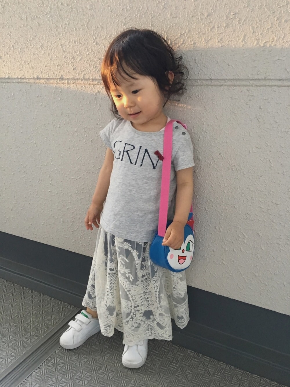 Tシャツ×レーススカンツ 去年買ったTシャツが今年は小さくなっていて子供の成長を感じました。