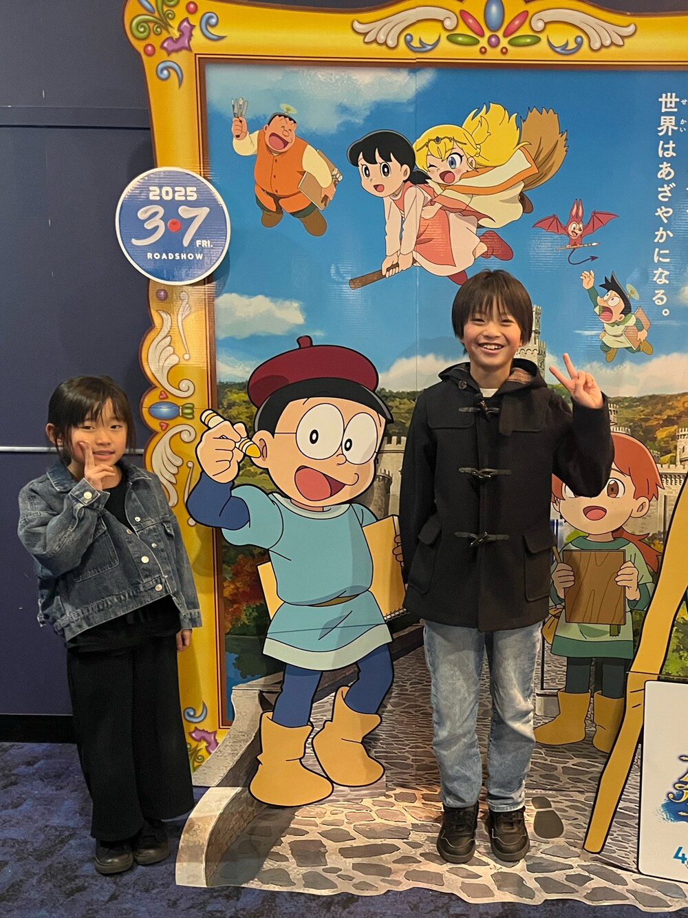 長男が大好きなドラえもん⭐️ 息子にピースしてとお願いしたらずっと恥ずかしそうにしていたけど、最終的にピース✌️ 妹よりニコニコで嬉しそうな表情がまた笑える🤭 この日はまだ寒かったから2人ともアウター羽織ってお出かけ。 娘のデニムジャケットはオーバーサイズで後ろにリボンも付いてる🎀 息子のダッフルコートは単品だとフォーマル向けだけどデニムとスニーカーを合わせてカジュアルに🙆♀️