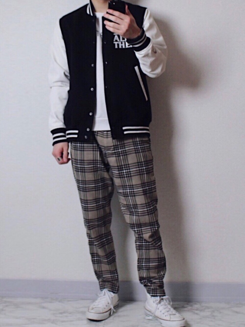 このチェックパンツ可愛くない!? めっちゃ可愛い言われるんやけど笑 スタジャンとコンバースと合わせて可愛い感じにまとめました😊