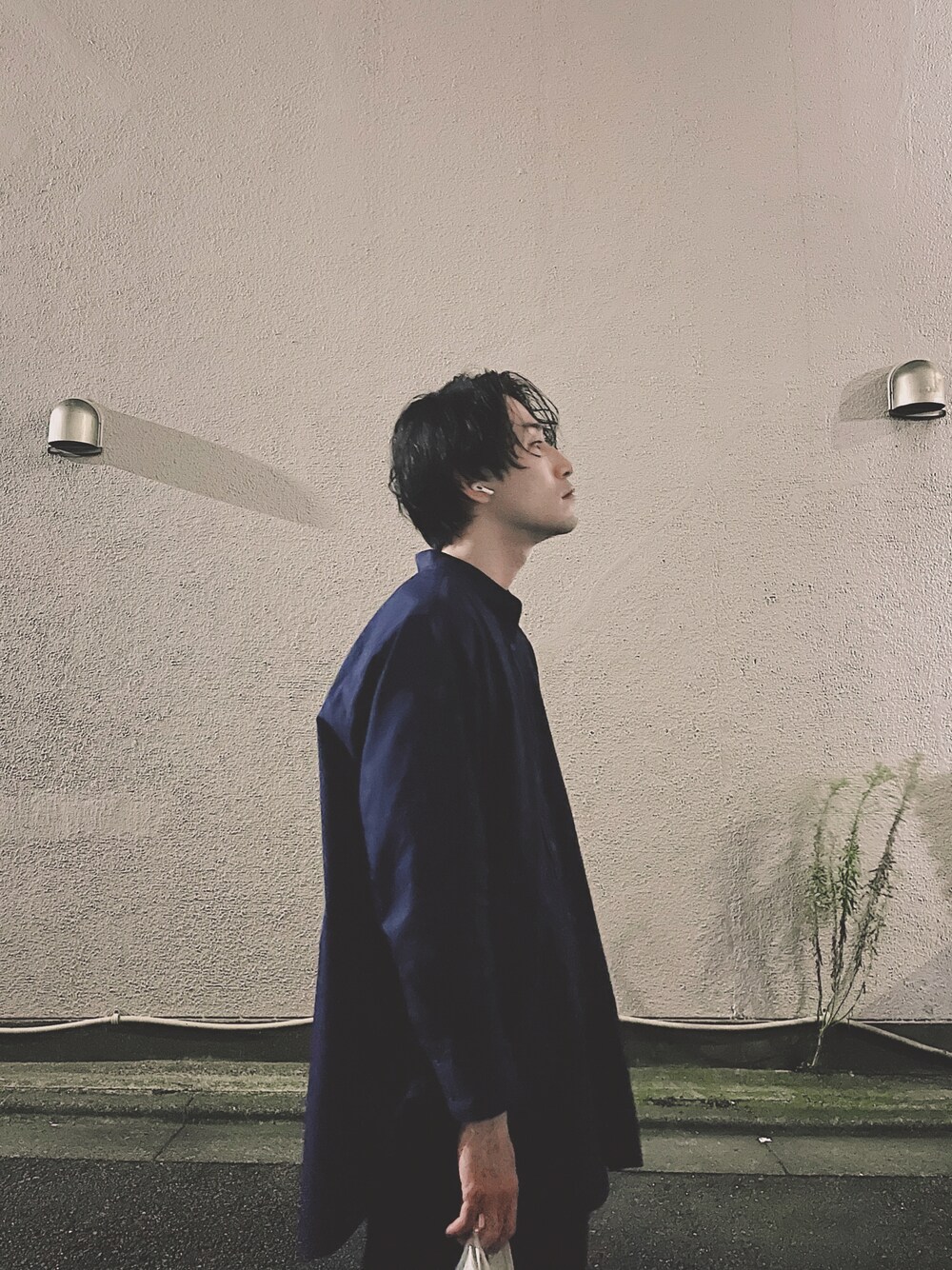 ブルー系のシャツ/ブラウスを着用したメンズの秋コーディネートの1枚目の写真