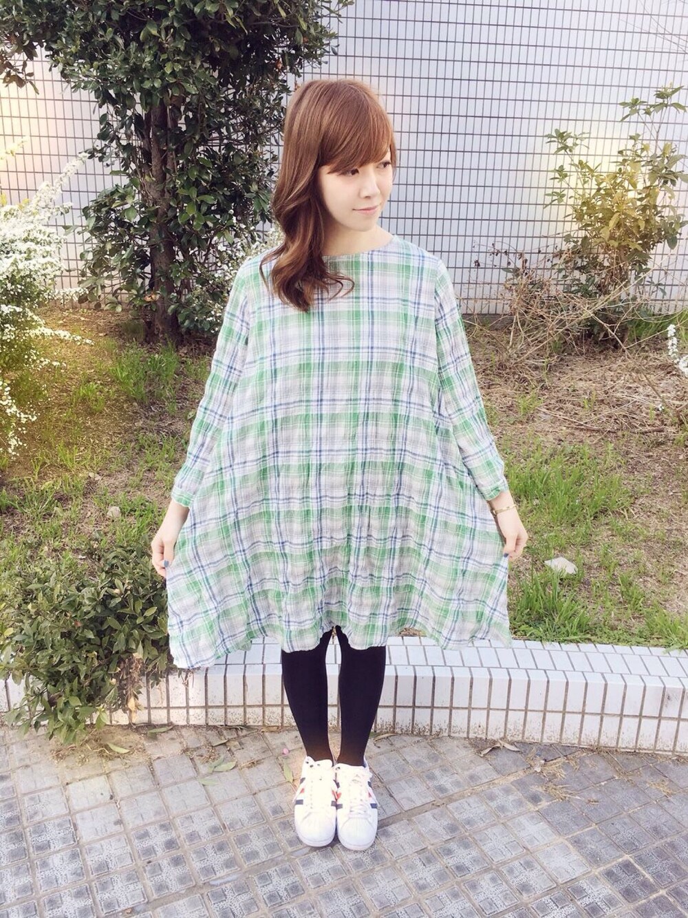 涼しげな春カラーのワンピース 足元はスニーカーで外して、トレンドコーデに♪