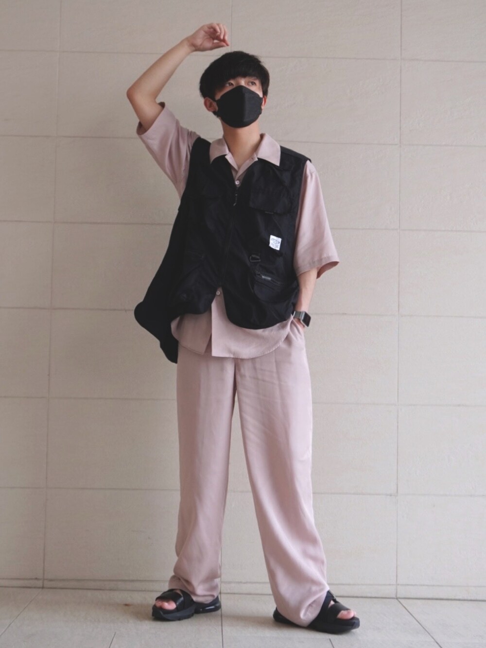 Instagram⇨kyo11_11 こちらにも遊びに来てください⭐️ いつも♡、➕、フォロー、フォルダーINありがとうございます💘 【PR】 agnes b.セットアップの着回しコーデ ADRERサンダルで脚長効果をだし、ベストでカジュアルに🤧