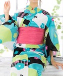 京都の着物屋さん 【KYOETSU】 着物屋さんの失敗しないコーディネート 浴衣+兵児帯+下駄+浴衣肌着の4点セット モデル身長:163cm 着用サイズ:フリー(ブルー系その他5/野花(兵児帯 チェリー))