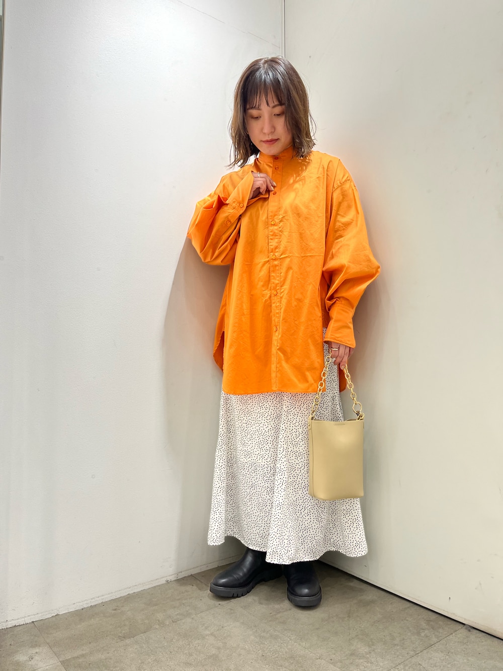 トレンド感たっぷりの袖のボリュームシルエットがとっても可愛いカラーコクーンシャツにトレンドのマーメイドスカートを合わせるのがおすすめです✨ カラーは5色ございますが、こちらのビタミンカラーのオレンジはコーデのポイントになってとってもおすすめです🍊🟠🧡