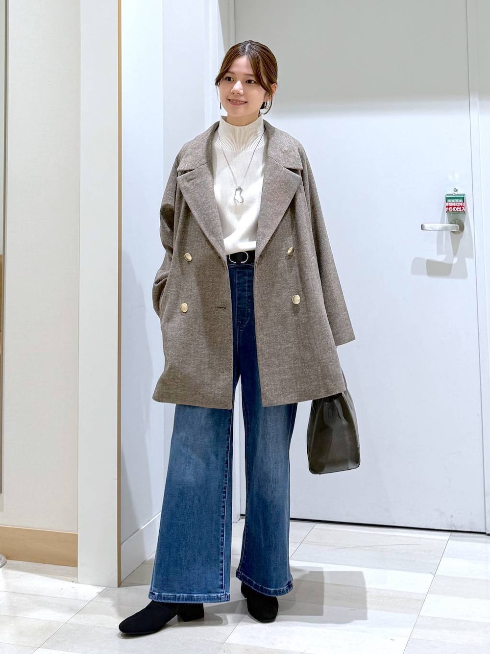 きれいめカジュアルコーデ♪ コート▽ 軽くて暖かいミドルコート。 私の身長だとSサイズがジャストサイズでした! ストレッチが効いていて動きやすさ抜群⭐︎ 衿元を立てるとスタンドコートにもなるよ! ゴールドボタンがコーデのポイント♪ スカートでもパンツでも合わせやすい丈感です◯。 ニット▽ ゆとりのあるサイズ感でSサイズから展開あり! ハイネックですが締め付け感はほとんど 感じることなく着られました♪ 柔らかい肌触りで着心地も抜群! デニム▽ 裏起毛のデニムパンツ!デニムなのに柔らかくて 履き心地抜群なんです♪ ウエストがゴムでゆったり履けるのに美脚見え♡ スニーカーでカジュアルにも良いし ローヒールブーツできれいめ合わせもお洒落⭐︎