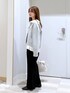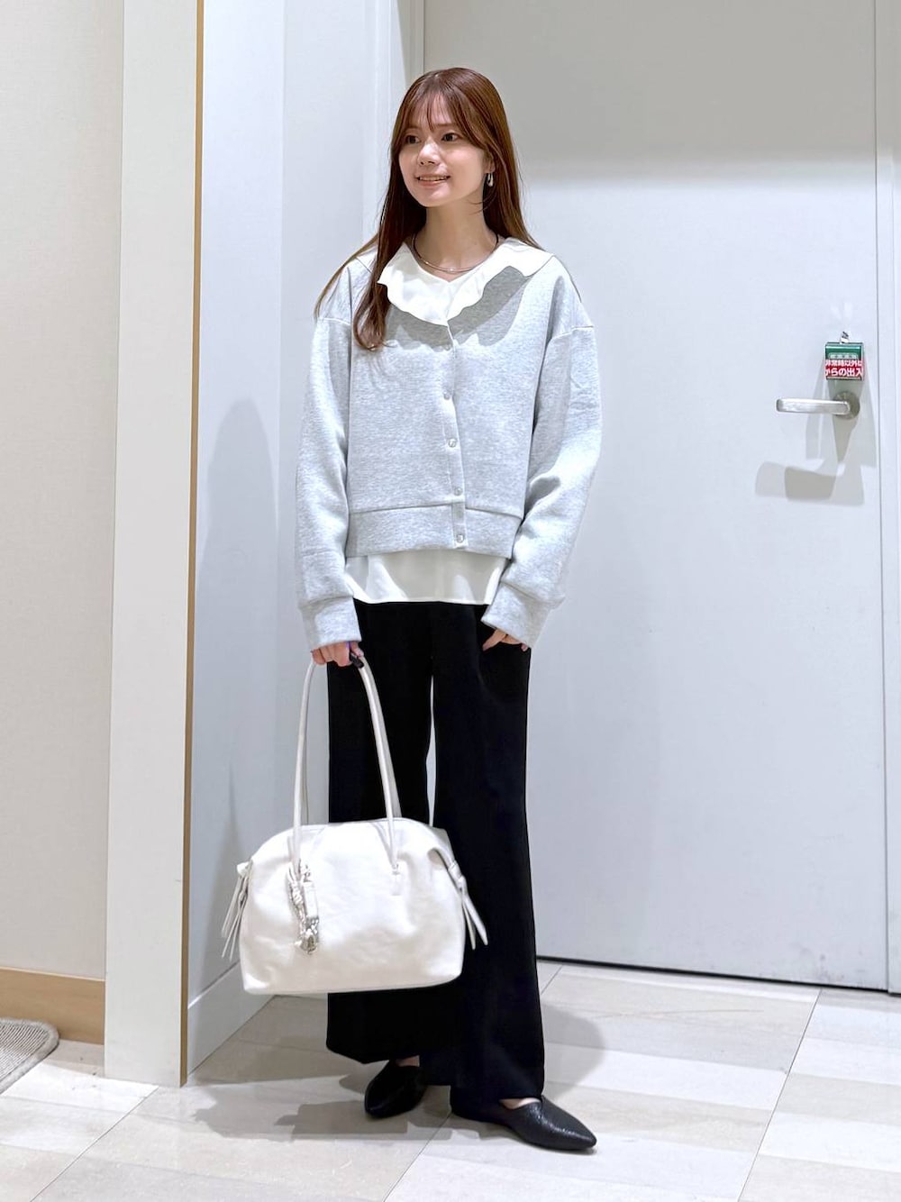 モノトーンコーデ◯。 カーデ▽ ダンボール素材でハリ感のあるカーディガン。 ゆったりと着られるサイズ感で、着丈はヒップが 半分隠れるくらい。1枚ではもちろんロンTや シャツをレイヤードするのもおすすめ⭐︎ スナップボタンで着脱も楽ちんです♪ ブラウス▽ 控えめフリルで大人でも着やすいフリルブラウス♡ ゆったり着られるサイズ感です。 程よいVネックになっているから顔まわりが スッキリして見られます♪ パンツ▽ ウエストゴムで履き心地の良いパンツ。 センタープレスが入っていて脚を綺麗に 見せてくれます!程よいゆとりがあるシルエットで きれいめにもカジュアルにも使いやすい! 私はsサイズがジャストサイズでした⭐︎