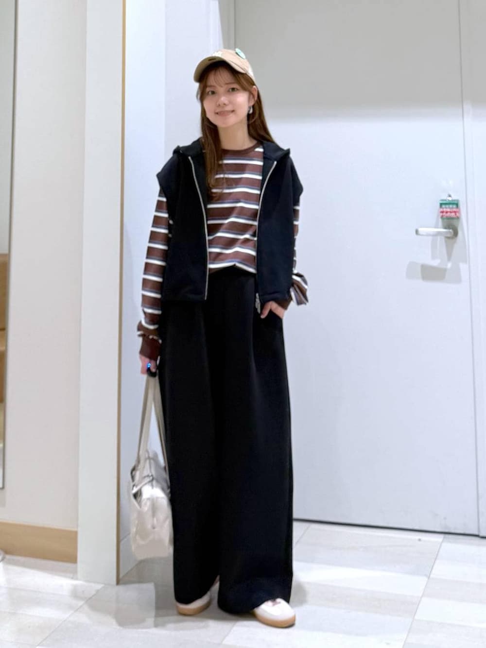 大人カジュアルコーデ♪ ロンT▽ 人気のヘビロッTEEのボーダーシリーズ♪ サイズはゆったり。袖は少しボリュームがあります。 配色が可愛いボーダーでトレンド感もだしてくれる! 大人なカジュアルコーデにぴったり◎ ベスト▽ ロンTやシャツに重ねるだけでトレンド感のある レイヤードコーデが完成するアイテム! 身幅はゆとりがあるサイズ感で着丈は短め。 Wジップになっているからインナーの見せ方を 変えられます♪ パンツ▽ ワイドシルエットのスウェットパンツ。 155cmの私だと丈が少し長く感じました! ウエストがゴム仕様なので低身長さんは 1折りするのもおすすめ♪ ストンと落ちてくれるシルエットで脚を綺麗に 見せてくれますよ!