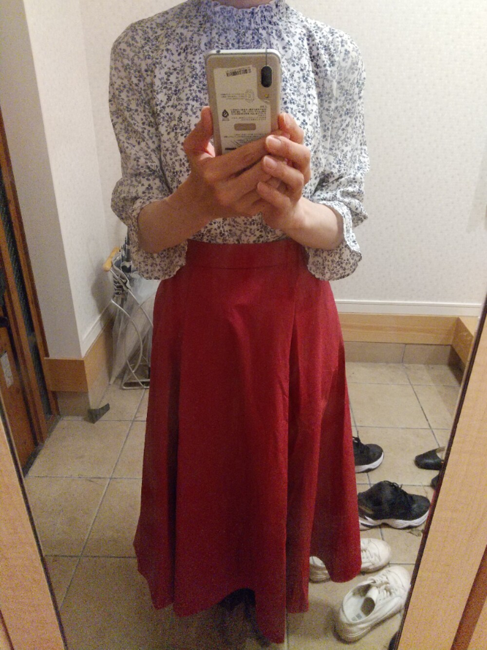 今日のお出かけコーデです 花柄ブラウスに赤のスカートをあわせてみました