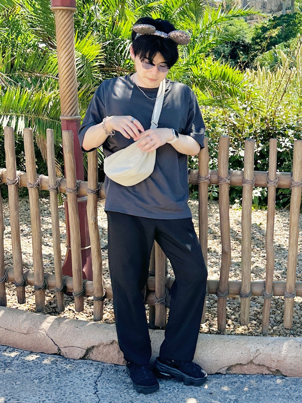 ご覧いただきありがとうございます! 真っ黒コーデだと暑苦しく見えてしまうので、Tシャツをチャコールにして涼しさもありつつ統一感を出しました👍 アクセントで鞄をユニクロのベージュのバッグをチョイス! 夏のディズニーは暑い!!!!