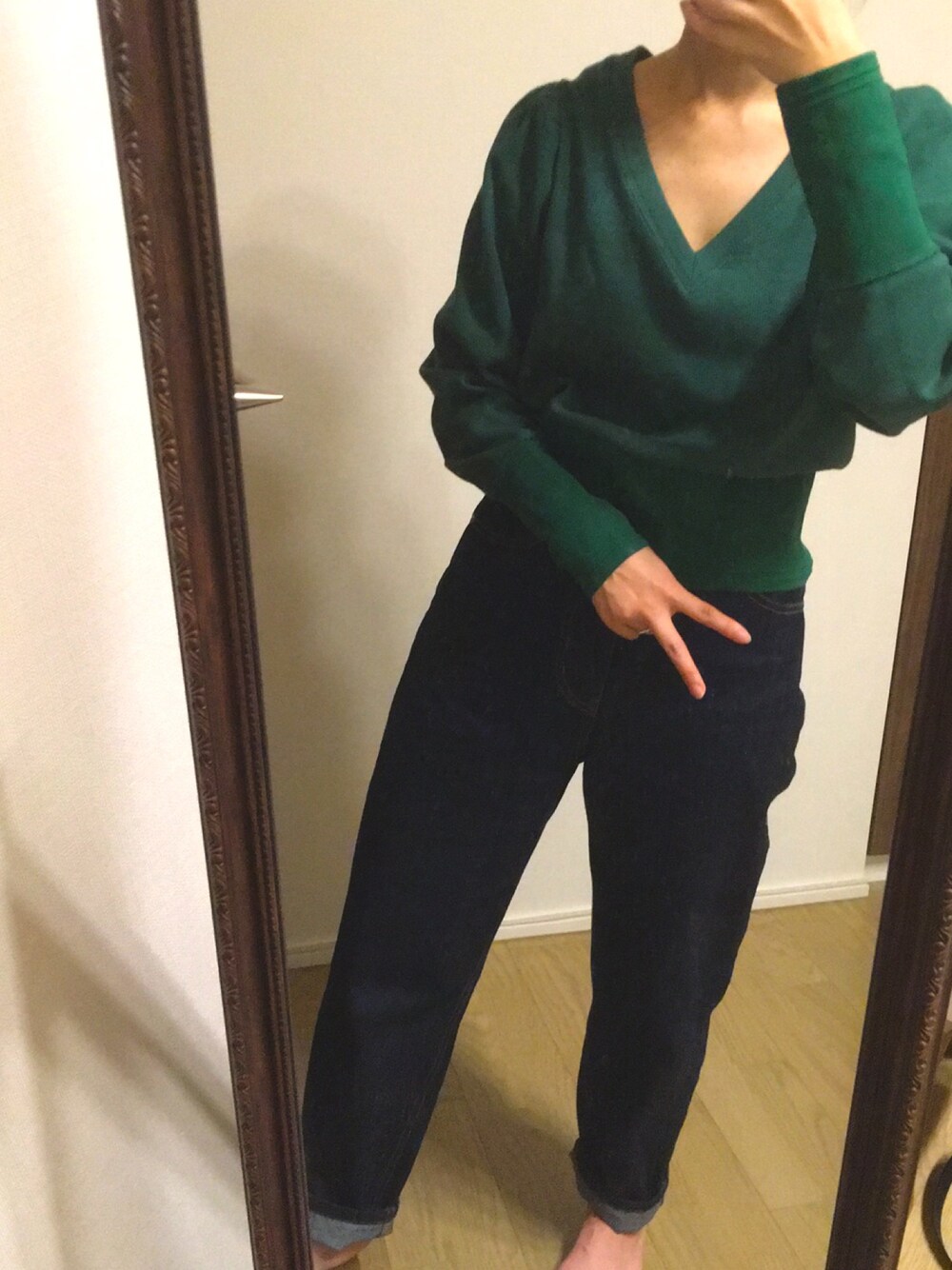 healthknitのVネック部分の空きが広すぎず狭すぎずGOOD! インディゴブルーでカジュアルに! 雨でもインディゴならハネとか気にしない!