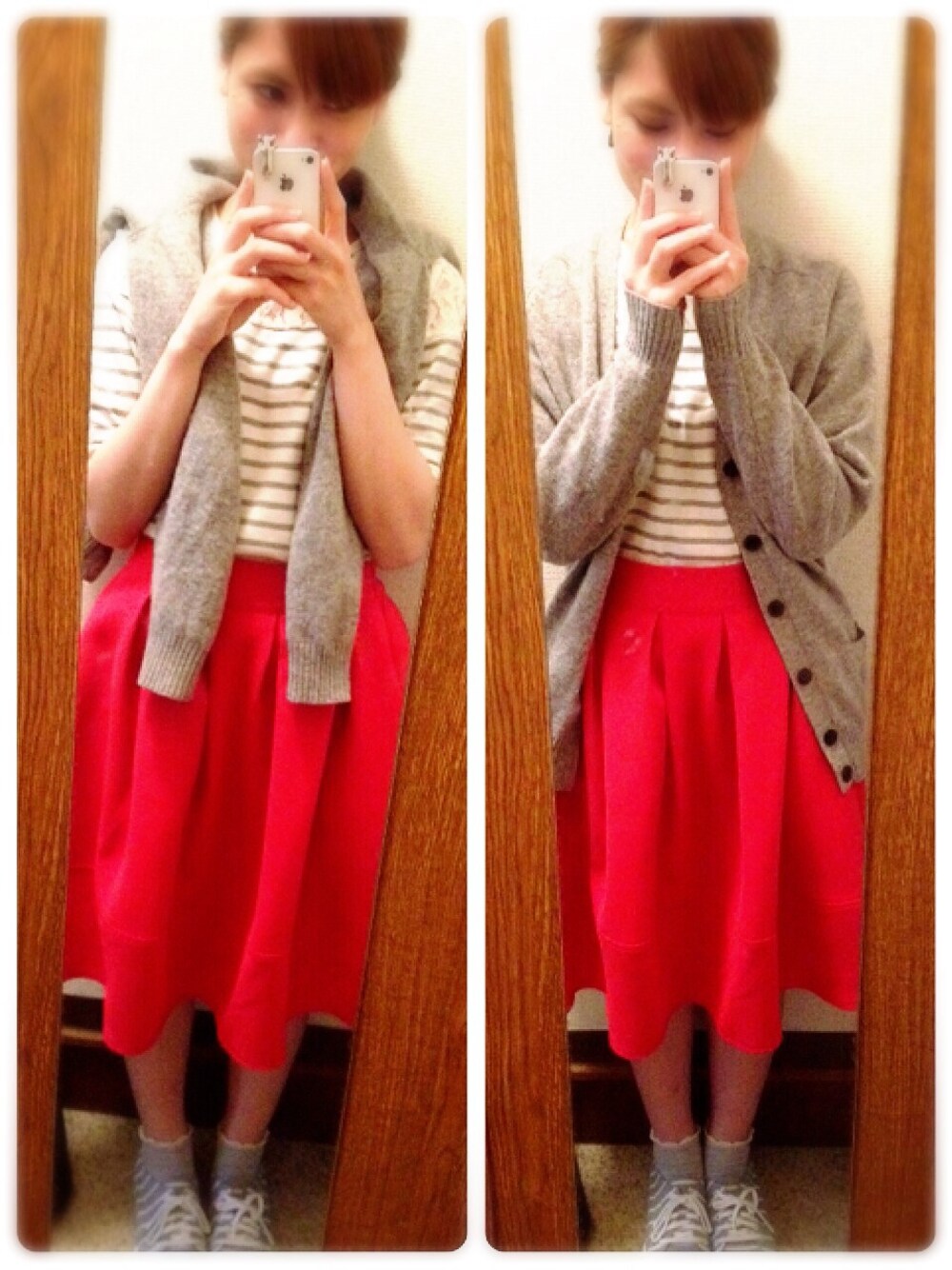 お題の赤いスカートをメインに あとはグレーでまとめてみました! (((o(*゚▽゚*)o))) 先輩に「ハイジみたい♡」と言われ ご機嫌な私♡笑←