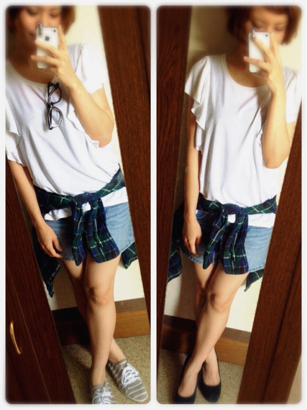 ピックアップタグの デニムショーパンコーデ♡ 天気も良いのでかなり 夏っぽくなっちゃいました!笑 女っぽくヒールか カジュアルにスニーカーか 迷ったけど両方あげちゃえー!笑