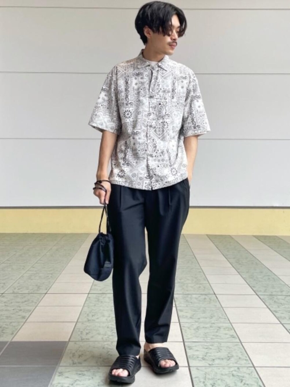 身長:175cm モノトーンでシックなチャイナシャツスタイリングを作りました。